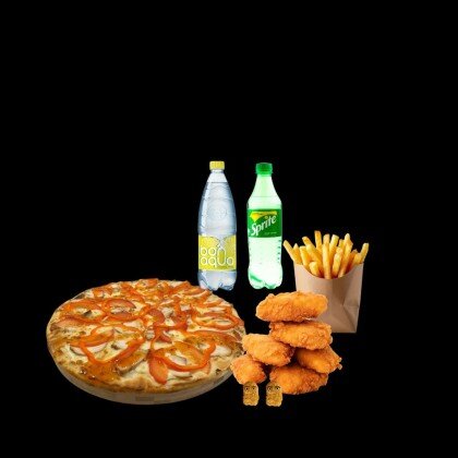 Пицца кисло-сладкий цыплёнок, пицца фирменная, сэндвич с мидией, соевый соус, напиток 1 шт