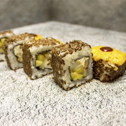 Рис, нори, сырная шапка, сливочный сыр, огурец, мидии